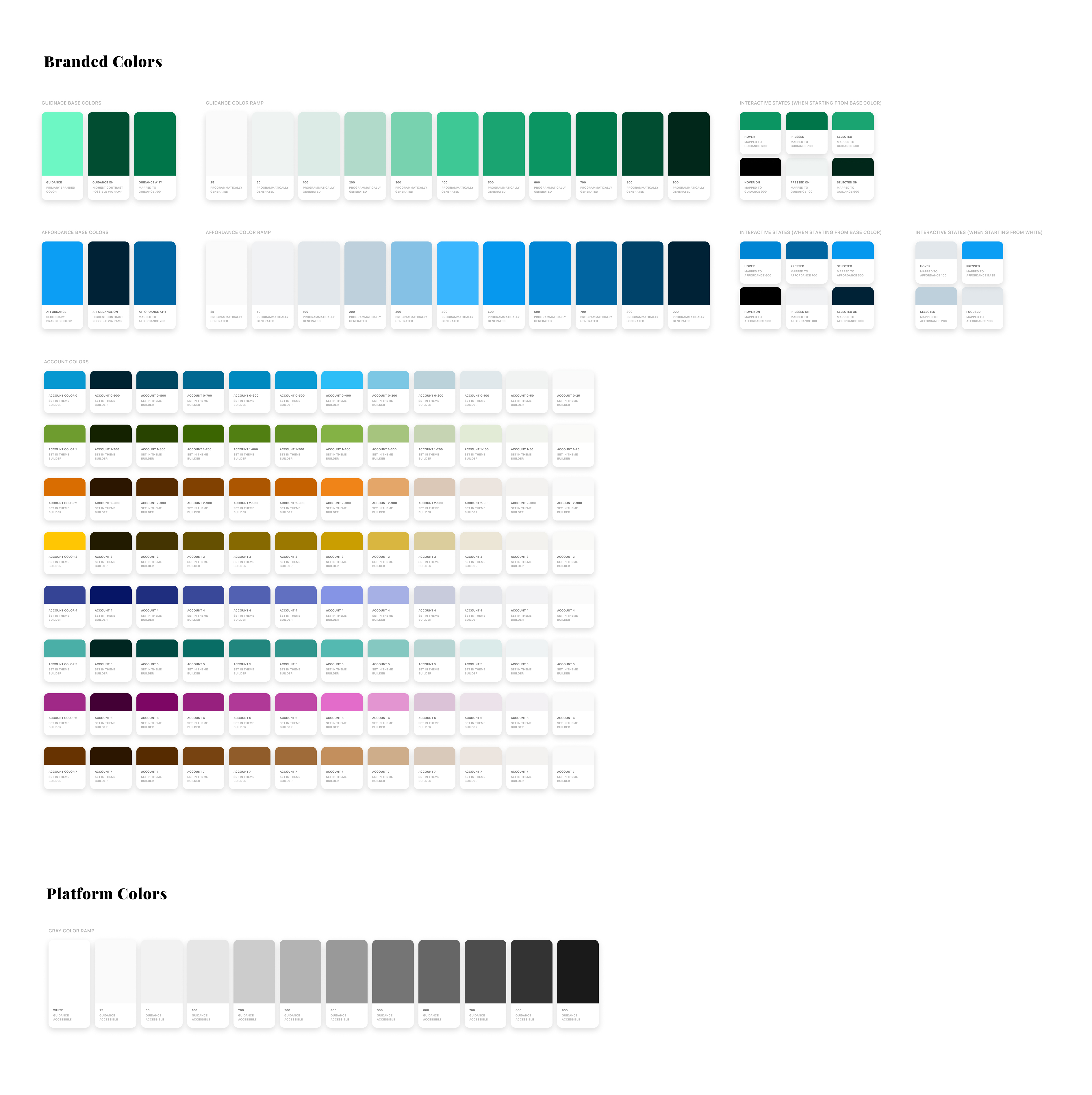 Using the RGB color model enabled the full spectrum of color to used in each ramp. In theory this provided the best possible scenario to future proof the ramps in the event a client used a unique set of branded colors. In practice though the color combinations and math required to ensure a consistent luminosity at each step regardless of the base color ended up being a large engineering lift.